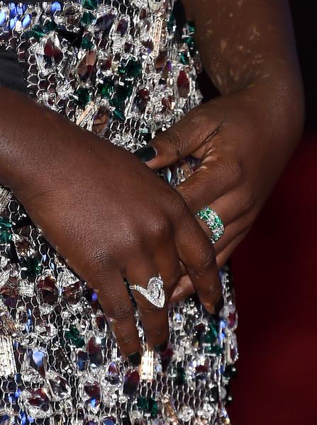Para enriquecer aún más su estilismo, la actriz kenyata de 32 años, lució fabulosas joyas de Chopard, unos pendientes de platino engastados con diamantes que brillaban bajo los focos y se reflejaban en su rostro.