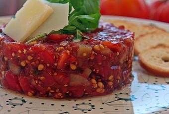 PREPARACIÓN:Rallamos grueso los tomates y desechamos el líquido, para ello usaremos un colador para que escurra bien.Por otro lado picamos la cebolla y los pepinillos, le ponemos la mostaza, lo mezclamos y se lo agregamos al tomate. Condimentamos con sal, pimienta, salsa perrins, salsa de soja y el zumo de limón.Emplatamos con un aro de y le ponemos para decorar unas hojas de rúcula, unas lascas de parmesano y sal en escamas.