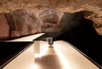 El espacio del vestíbulo incorpora una ventana arqueada que da a la pasarela, que desciende gradualmente a través de una galería oscura y abovedada que muestra capas de construcción desenterradas durante las excavaciones.