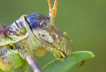 "Detalle de alimentación de esta especie escasa y de distribución pirenaica. Pertenece a la familia Bradyporidae, que cuenta con unas 60 especies en la Península Ibérica, casi todas ellas endémicas y circunscritas a macizos montañosos o sierras concretas. Son grillos de matorral de tamaño grande y robustos, con alas pequeñas. En la imagen se ve una hembra sobre una hoja de euforbia."