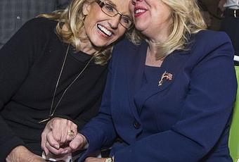 La ex gobernadora Jan Brewer, izquierda, y Debbie Lesko, derecha, celebran la victoria en una campaña que se reúne en su casa en Peoria el 27 de febrero de 2018. Lesko se adelantó en las elecciones primarias especiales. (Foto: Tom Tingle / La República)
