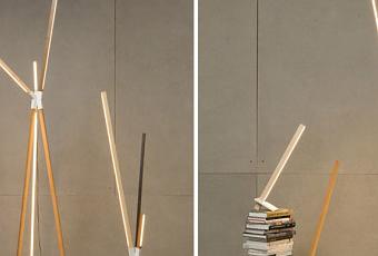 Rux design. Han creado una colección de lámparas modulares de LED integradas en vigas de madera con pie o base de acero. Hay lámparas de pie, sobremesa y apliques de pared en distintos tamaños.