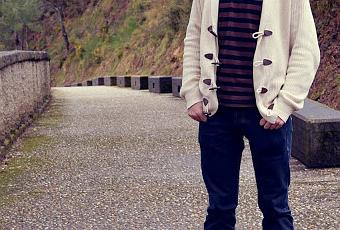 En este caso Rubén ha apostado por un outfit cómodo y sencillo para el día a dia, con una de sus chaquetas de punto preferidas este invierno (¡muy combinable por cierto!), sobre un polo a rayas de la temporada pasada y vaquero en tono oscuro. Como novia he de decir que me encanta como le sientan los tonos tierra, así que con este outfit le veo guapísimo ^^.