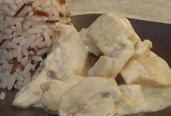 Una vez tenemos los champiñones y la cebolla añadimos el pollo que hemos reservado, con un vaso de vino y dejamos que se evapore el alcohol.