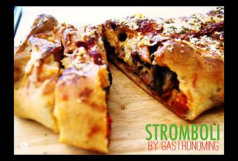 El Stromboli o Estrómboli en castellano (Struògnuli en Siciliano), además de ser un volcán de una pequeña isla con el mismo nombre ubicada en un archipiélago al norte de la costa siciliana en el mar Tirreno, es un híbrido entre pizza, calzone y/o empanada, es hecha tradicionalmente con masa de pizza y comúnmente rellena de carnes italianas como la capicola, pepperoni, muffuletta, salami, salchichas frescas de cerdo de gran calidad y gran porcentaje de carne, mínimo un 85%,… varios quesos y vegetales. Su origen no es italiano, más bien fue creada en los Estados Unidos, su creador fue un italiano, Nazzareno Romano y lo creó en su restaurante, el Romano´s Italian restaurant & pizzeria en las afueras de Philadelphia allá por el año 1950 y recibiendo su nombre por la reciente película estrenada en la época, nombre sugerido por un amigo de Don Nazzareno, que tuvo mucho exito y pasó a engrosar la larga lista de comidas del recetario italo-americano, también otros reclaman la autoría desde plato, como un tal Mike Aquino del Mike´s Burger Royal, donde, este lo vendía como un sándwich en la ciudad de Spoken, Washington, que también nombró así a su sándwich por la película. Hacerlo no tiene mayor dificultad que hacer una pizza, aunque algo más de paciencia, se acostumbra comer como tal o como un tentenpié rápido en un take away donde se vende en porciones y que podrás ir comiendo mientras llegas a tu destino.