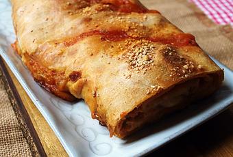El otro día me topé con esto del Stromboli que es una pizza enrollada, aunque su origen no es italiano sino americano. Es más fácil de comer, por eso que no se te escurre y suele ir acompañada de salsa para untar, por lo que para una reunión familiar o con amigos está bastante bien.