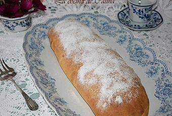 Colocamos en una bandeja de horno con la unión hacia abajo. Horneamos durante 50 minutos hasta que esté crujiente y dorado. Dejamos reposar y espolvoreamos con azúcar glas.