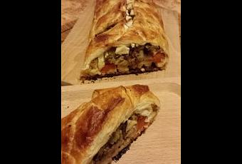 Por ultimo vertemos las patatas en cubitos, los tomates cherry cortados por la mitad y los cubitos de queso feta. Mezclar y enfriar todo. Vaciar la sarten y sin limpiarla verter las migas de pan y cocinar hasta que se doren. Ahora tomamos el rectangulo de hojaldre y llenarlo con las migas dorada y despues lo de la sarten. Todo tiene que estar en el medio de el rectangulo para facilitar el cierre de lo strudel. Con una tijera practicamos cortes pequenos longitudinales y porfin con una mezcla de yemas de huevo y crema de leche mojamos la superficie de el strudel. Calientamos el horno a 160 grados y cocinamos el strudel por mas o meno 20 minutos. Tiene que quedar como en la foto…..doradito. Servir tibio con un buen vaso de vino blanco con burbujas. Optimo como aperitivo en mayor cantidad puede convertirse en un segundo plato muy bueno.