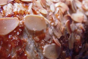 - Empezamos a enrollar la masa como si fuera un brazo de gitano, con cuidado la pasamos a la bandeja de horno, el que habremos calentado antes a unos 190º, pintamos con yema de huevo y también se le puede pintar con leche, pero no queda tan dorado, se puede dejar así o a mi me gusta ponerle unas pocas almendras fileteadas o un poco de azúcar para que luego forme una pequeña costra, lo metemos al horno, ya sabéis que cada horno varía, pero mas o menos 35 minutos a 190º, lo veréis el dorado que os guste.