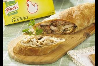 - Con un pincel, pintar la superficie con manteca, espolvorear con pan rallado, en un de los extremos colocar el relleno de pollo ya frío e ir enrollando.