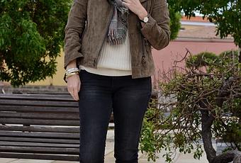 Hoy toca un look sencillo, con piezas básicas como el vaquero negro y el jersey crudo a los que les fui añadiendo prendas con un poco más de vida, como la chaqueta de piel (ya la vieron en este post), la bufanda de cuadros (que combiné con azul marino aquí) y los botines con tachuelas que les enseñé antes de Navidad en Instagram (@pshopperblog).