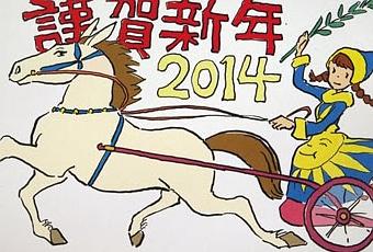 Studio Ghibli, como suele ser habitual, hace referencia al calendario chino, para el que 2014 es el año del caballo de madera. La ilustración, que se puede ver en la web oficial, está acompañada de un texto en el que, aparte de felicitar el año, agradecen encarecidamente el apoyo a Studio Ghibli y el éxito de las producciones estrenadas el año pasado (Kaze Tachinu y Kaguya-hime no Monogatari). También animan, a quien no lo haya hecho aún, a acudir a las salas de cine a verlas, puesto que todavía se proyectan. Añaden que esperan seguir haciendo el mejor trabajo juntos, y que el éxito continúe en 2014 con el estreno en verano de la película de Hiromasa Yonebayashi Omoide no Marnie (When Marnie Was There).