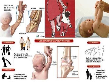 Puedes ver a la izquierda como unos papás juegan con su peque de manera incorrecta... hay que evitar a toda costa este tipo de posturas pues casi seguro llevan a esta lesión tan dolorosa !! Y es que nunca hay que columpiar ni elevar por los aires a los peques sujetándolos por las manos o muñecas.... Siempre es conveniente hacerlo bien por la cintura, bien por las axilas !! Y me lo aplico a mi misma porque reconozco que en algún momento de apuro (cuando la peque me hace sentadas en las tiendas, en la carretera, ... ) lo he hecho !!