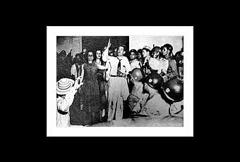 Fotografía que muestran al recién posesionado Presidente de la República el Doctor Arnulfo Arias en el Cuartel Central de la Policía Nacional, en el cual recibió las muestras de lealtad y subordinación del Comandante Primer Jefe de la Policía Nacional Coronel José A. Remón Cantera en aquel 24 de noviembre de 1949.