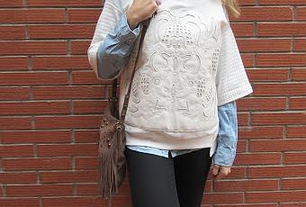 Hola chic@s!! Como estáis ? va bien la semana? que no me entere yo de lo contrario ehhhhh. Hoy os traigo un look muy funcional para las jornadas laborales del día a día. He elegido esta sudadera de ZARA con originales aplicaciones en piel para sentirme cómoda en todo momento. Ya sabéis que las prendas vaqueras siguen presente un año más así que he escogido esta camisa de manga larga de Zara para protegerme del frío y darle un toque más desenfadado al look. ¡¡Quería romper el black&white!! Los pantalones negros formalizan el look para no ir demasiado informal al trabajo junto con las nuevas sandalias planas print animal con tachas (Zara). Y he aprovechado para unirme a la tendencia de los flecos con este bolso de piel y tachas de Bershka. Y por supuesto no podía faltar al look una nota vintage como es mi anillo flor rosa de un Toquevintage un diseño de mi queridisima amiga Sonia que hace los mejores diseños inspirados en décadas pasadas.