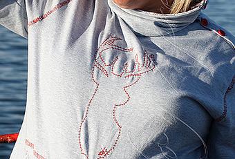 Como no me gustaba la sudadera pensé en darle un toque mío, de color, y le "bordé" (si se puede llamar bordar a eso) un ciervo, en el lugar de los codos, tuve otro momento de inspiración y "bordé" unas cornamentas.Las costuras las adorné con un punto de fantasía que tiene mi máquina, haciendo ver que las hacía con recubridora.En vez de broches (snaps, de nuevo oujéaaa) puse botones rojos porque, los broches que yo tengo en casa son metálicos y grandontes y me parecía "mucho lujo pa la burra".