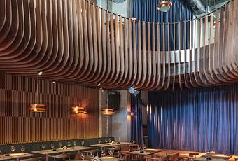 La orgánica volumetría que definen los listones de madera que recubren los muros obedece a requerimientos acústicos.