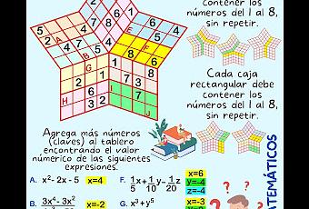 Seguimos con el juego del sudoku, un juego de lógica, donde los números se colocan en una casilla por algo, no al azar. En esta oportunidad les traemos un sudoku estrella, en el que cada hilera y cada caja rectangular debe contener los números del 1 al 8, sin repetir. Tener en cuenta que puedes agregar más números claves al sudoku, encontrar el valor numérico de las expresiones algebraicas y de esta manera bajar el nivel de dificultad del juego.