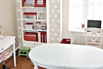 Hace tiempo que llevo viendo por varios blogs, sobre todo americanos, imágenes de habitaciones dedicadas a las manualidades. Para mí es un sueño. Yo que tengo mil cosas, papeles, hilos, telas, troqueles, fieltros, botones... tengo que hacer las mil y una para que mi piso no parezca un mercadillo. Siempre que me pongo a hacer algo monto mi despliegue de trabajo. En casa tengo una pequeña habitación donde tengo mi despachito y donde guardo todas mis cosas, pero es eso, un despachito. O pongo el ordenador, o pongo mi despliegue de troqueles, papeles, telas y pegamentos varios.