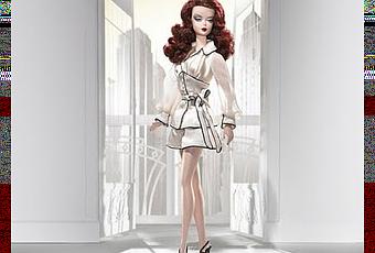 Suite Retreat es una muñeca Barbie que rezuma glamour y lujo. Esta sensual pelirroja lleva una chaqueta de pijama charmeuse con botones de perlas y blusa con mangas de gasa. Su toque lo ponen sus pantaloncitos con filo negro de satén. Lleva sandalias negras y pendientes de perlas. Diseñada por Robert Best.