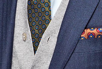 Este look es de mis preferidos. El traje gris está más de moda que nunca, pero si lo combinamos con un chaleco o cárdigan de punto azul marino y además incluimos una corbata con tonos vivos como esta la combinación no puede ser mejor.
