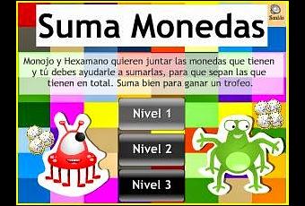 Os presento un sencillo juego online de Vedoque Suma Monedas para practicar sumas sencillas de una cifra, sin llevadas, y de números comprendidos entre el 1 y el 10 utilizando monedas. Nos viene de maravilla a los niños de Educación Infantil 5 años.