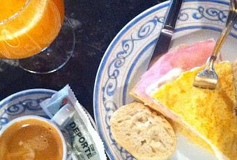 Yo, a lo mio, a mi desayuno, y a la vida contemplativa, por un día, que para eso me lo he tomado libre en el trabajo. La tortilla, templada, jugosa y con la patata bien fusionada con el huevo, que no hay nada peor que esos divorcios entre tubérculos y huevos. Me encantó el café, a pesar de ser descafeinado y no tener todo el aroma, y agradecí un poco de leche fría, una no está acostumbrada a esos calores.