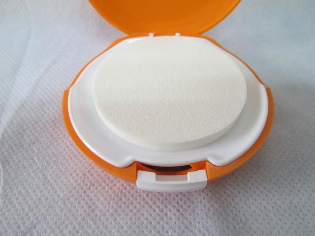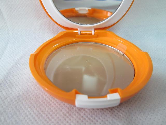 Este maquillaje, se presenta en un estuche naranja con una esponjita en una tapa, y un espejo y el maquillaje por el otro lado.