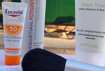 Crema facial Plantea con protección de 50, vitamina E. Loción solar Eucerin, también con protector de 50. Tratamiento para el cabello de Sebastian, perfecto para recuperar el brillo y la suavidad del pelo. Crema corporal hidratante Magic Touch de Rituals con aroma a cerezo. ¡Os encantará! Jabón dermatológico de Babe, perfecto para después de un buen baño en la piscina. Brocha Beter perfecto para extender polvos y sombras.