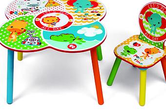 La mesita tiene un gran compartimento redondo de almacenaje en el centro y tres piezas de encaje con diferentes formas para jugar. La sillita a juego con el divertido estampado.