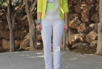 Hoy un look en color blanco combinado con tonos fluor! Tenía muchas ganas de enseñaros esta camiseta, la compré en Zara hace algunas semanas y ahora que el tiempo ha mejorado, por fín he podido estrenarla. La he combinado con mi chaqueta de Zara del año pasado ¿os acordais de ella?