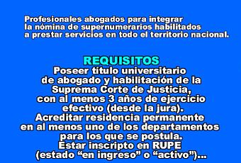 ✅ Requisitos Excluyentes:No ser funcionario público (excepto docentes).Estar en condiciones de contratar con el Estado (Art. 46 TOCAF).Poseer título universitario de abogado y habilitación de la Suprema Corte de Justicia, con al menos 3 años de ejercicio efectivo (desde la jura).Acreditar residencia permanente en al menos uno de los departamentos del llamado.Estar inscripto en RUPE (estado “en ingreso” o “activo”).