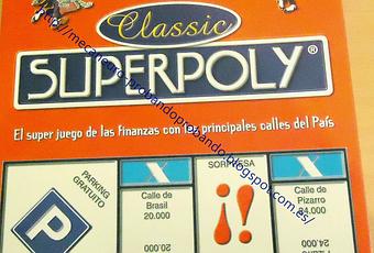 En lo que respecta al SUPERPOLY, es un juego de mesa que pretende imitar al famoso juego MONOPOLY, pues tanto su jugabilidad como sus reglas son las mismas. SUPERPOLY es la "versión barata" de este famoso juego, que divierte igual que el original.Existen diferentes tipos de juego Superpoly:- Superpoly