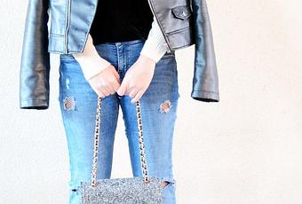 En cuanto a superposición en este look, un jersey plisado color crudo con un top de terciopelo por encima. Y para darle el punto rock al outfit una biker negra.