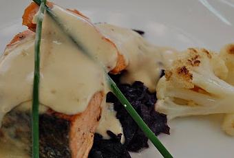 Se calienta la plancha y se sellan, primero por la parte de la piel y después por la carne. Se termina en el horno a unos 200ºC durante 3-4 minutos.Se presenta colocando el chucrut en el plato y el salmón encima. Se colocan los arbolitos de coliflor y se napa (cubre de salsa) el salmón. Se decora con unos cebollinos.