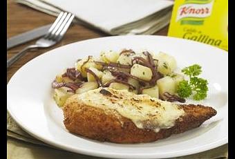 - Poner en una placa las supremas ya fritas, cubrir con la salsa y espolvorear con el queso parmesano. Llevar al horno hasta gratinar.