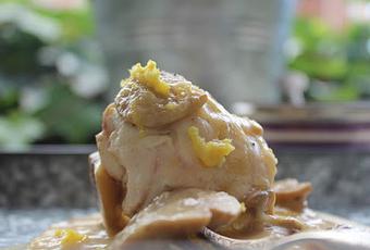Reservas las pechugas en un plato cubierto con papel de aluminio, intentando que no se enfríen. Añades a la cazuela el vino y el caldo, cuando empiece a espesar incorporas la nata y el zumo de limón.Presentas la pechuga cubierta con la salsa de champiñones y espolvoreas con piel rallada de limón.
