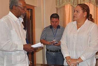 Rubén García, Soberano Gran Comendador de la Logia Masónica en Honduras, le entregó el código de ética masón a la vicealcaldesa de este municipio, Dina Mercedes Maldonado.