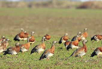 Luego de haber dado una vuelta en círculo por el potrero me despedí de Carlos que debía volver a Orense y yo decidí recorrer otra vez el campo para intentar más fotos, pero los cauquenes se habían ido todos a un sector lindero que era casi todo tierra preparada antes de ser sembrada, había una enorme bandada donde había unos 300 cauquenes colorados y muchos cauquenes reales, los conté sacando numerosas fotos al grupo. Primero los observé desde el alambrado, luego lo pasé e ingresé caminando, acercándome solo un poco más, intentando mejorar el ángulo de la luz pero como era muy esperable en un campo raso todas las aves se volaron, regresando al mismo lugar una vez que retrocedí rumbo a mi auto unos cuantos pasos.