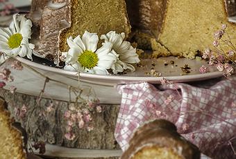 ~A parte, sacamos las semillas del cardamomo y machacamos en un mortero. Tamizamos la harina, la levadura y la sal y echamos las semillitas encima. Echamos esta mezcla en tres veces en nuestra mezcla de ingredientes húmedos y removemos tan sólo para que se mezcle bien, sin incorporar más aire.