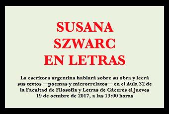 La escritora argentina Susana Szwarc (Quitilipi, Chaco, Argentina 1954) participará en Cáceres este viernes 20 (20:00 horas), en la librería Psicopompo, junto a Elena Román y a Carmen Hernández Zurbano, en un encuentro bajo el título de Los poetas no son gente de fiar, que es el de la revista microscópica de poesía editada por Ediciones Liliputienses, sello en el que las tres autoras han publicado sus textos. El jueves 19, a las 13:00 horas hará una lectura de sus poemas y microrrelatos en la Facultad de Filosofía y Letras —aula 32— y dar a conocer su obra entre los estudiantes universitarios. Susana Szwarc es autora de numerosos libros de poesía y de narrativa. El artista del sueño y otros cuentos (Tres Tiempos, 1981); En lo separado, poesía (Último Reino, 1988): Trenzas, novela (Legasa, 1991); Bailen las estepas, poesía (De la Flor 1999), editado también en España por Ediciones Liliputienses; Bárbara dice, poesía (Alción, 2004); El azar cruje, cuentos (Catálogos, 2006); Una felicidad liviana, cuentos (Ediciones Ross, 2007); Aves de Paso (Ed. Cilc, 2009); La mesa roja (Desde la gente, Instituto Movilizador de Fondos Cooperativos, 2012); El ojo de Celan, poesía (Alción, 2013), entre otros. Desde 1985 coordina seminarios y talleres de lectura y escritura en diversas instituciones públicas y privadas, entre ellos, los del Plan de Lectura de la Secretaría de Cultura de la Nación fundado por Hebe Clementi, de la Municipalidad de la Ciudad de Buenos Aires, Escuela Normal Nº4 de la Ciudad de Buenos Aires, Museo Ricardo Rojas, UBA, Bibliotecas Populares de todo el país; en diversas instituciones de las provincias argentinas (Chaco; Catamarca; Tucumán; Santa Cruz, etc.); Casa de América en Madrid, España; entre otros. Ha recibido diversos premios entre los que se destacan el Primer Premio Nacional Iniciación de Poesía (1987), el Premio Unesco (Buenos Aires, 1984), Premio Antorchas a la Creación Artística (1990), Premio Regional de Novela correspondiente al NEA-Litoral otorgado por la Secretaría de Cultura de la Nación(1993), Primer Premio en el II Concurso Literario XICOATL en la Categoría Cuento, (Salzburgo, Austria, 1994); Tercer Premio en el Concurso Fundación Inca en la categoría Narrativa breve (1995); Premio Único de Poesía de la Municipalidad de la Ciudad de Buenos Aires (1998), Mención en el Concurso Internacional de Cuentos Julio Cortázar (2003).