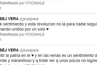 Diario Ultimas Noticias La actriz Susej Vera manifestó sentirse orgullosa del presidente Chávez, a través de su cuenta en la red social Twitter @susejvera. En su perfil en la red social “Orgullosa de un hombre que fue capaz de cambiar la historia y de entregar no sólo su corazón por esta patria, nos devolvió la dignidad viva Chávez”.