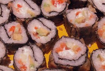 INGREDIENTES:Hojas de algaZanahoriasPepinoAguacateSalmón ahumadoQueso de untar tipo FiladelfiaArroz hervidoHarina de tempuraAgua fríaMielSojaEsterilla para enrollarlosPREPARACIÓN:Empezamos preparando el arroz, tiene que quedar seco y bien cocido, se usa uno que venden especial para ello o el de grano redondo como en mi caso,