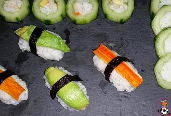 Ponemos el arroz en un colador y lo ponemos bajo el grifo y lavamos hasta que el agua caiga transparente.Ponemos un caldero con el agua y el arroz al fuego y dejamos que hierva. Apagamos el fuego y dejamos reposar 10 minutos con la tapa puesta y otros 10 destapado. En otro caldero ponemos el vinagre el azúcar, la sal y calentamos. Ponemos el arroz en una bandeja y añadimos la mezcla de vinagre,azúcar y sal,removemos bien con cuidado y reservamos una media hora. Pelamos el pepino lo cortamos por la mitad y lo vaciamos con cuidado con un cuchillo o cuchara.Rellenamos con cuidado con el arroz y le podemos añadir aguacate en trocitos y surimi. con un cuchillo bien afilado cortamos el pepino en rodajas y colocamos en un plato .