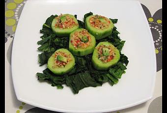 - Corta las espinacas en tiras y colócalas en la base del plato. Pon los rollitos de pepino encima y espolvorea semillas de sésamo por encima.