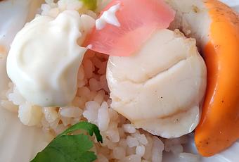 INGREDIENTES PARA DOS PERSONAS:2 peregrinas grandes (vieiras), el zumo y la raspadura de media lima, arroz para sushi recién cocido (la receta y el paso a paso lo pueden leer pinchando en ÉSTE ENLACE, una rama de cilantro fresco, jengibre encurtido, pasta de wasabi, 3 cucharadas de mayonesa japonesa (mezclando mayonesa con un poco de salsa de soja) y sal.