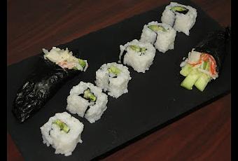 Una vez que tenéis una especie de rollito alargado hecho, le quitáis el papel film, lo cortáis por la mitad y vais cortando vuestros California Rolls. Para el sushi temaki, cogéis la mitad de un alga nori y ponéis bien de arroz bien apretado y los ingredientes que queráis encima, en este caso pepino, aguacate y surimi con mayonesa y enrolláis como una especie de cono, le echáis un poco de agua en el lateral y la pegáis y así os queda un especie de cono para llevaros a la boca
