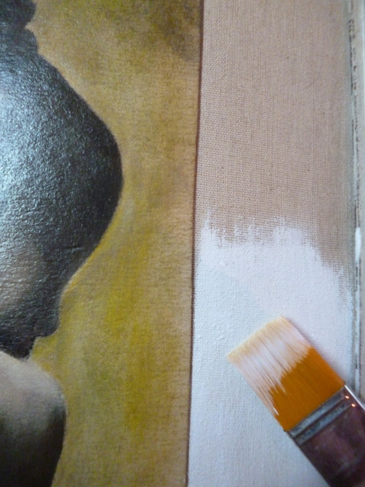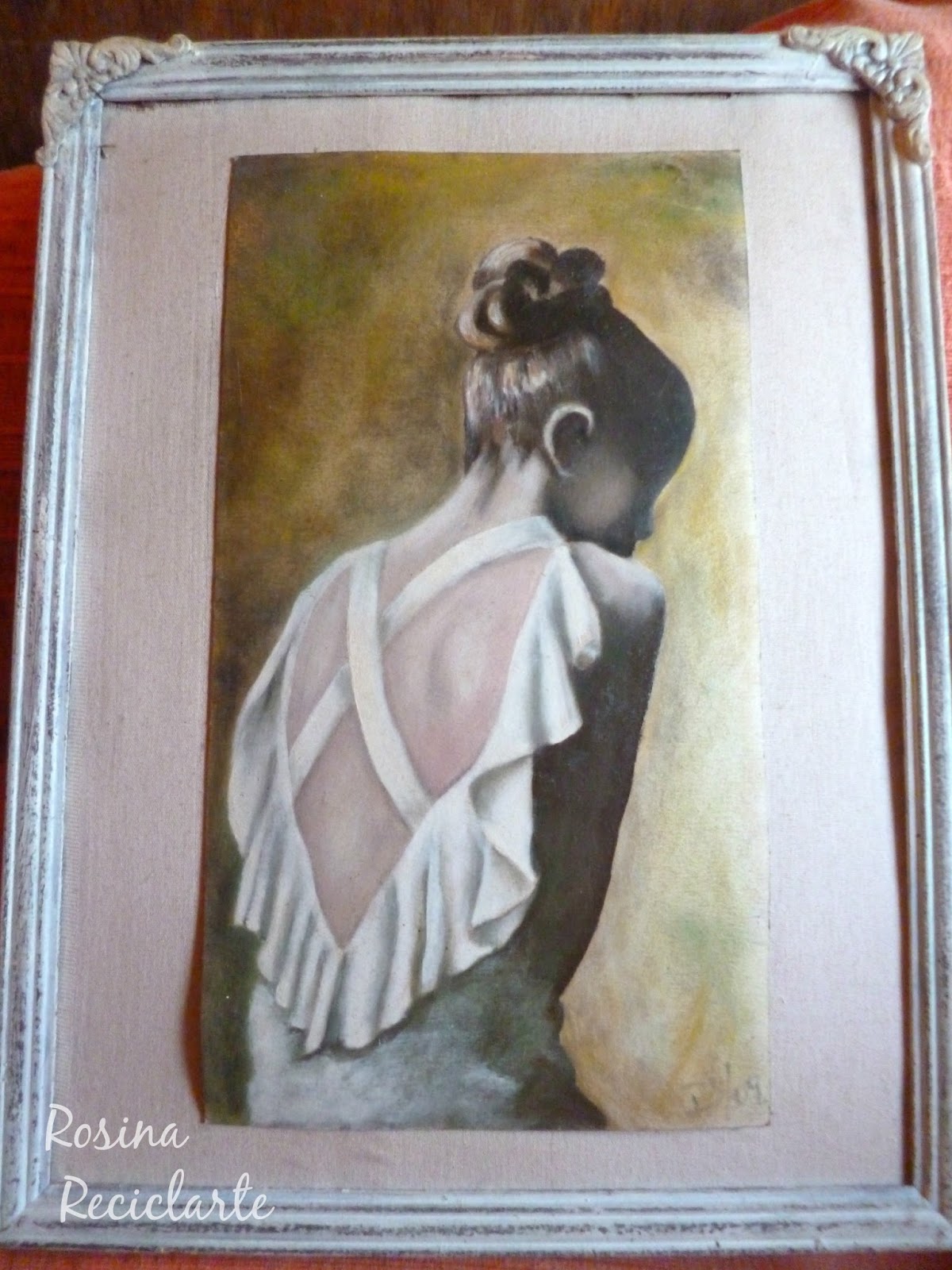 La "Mujercita en blanco", así se llama la obra;había sido enmarcada por mi, te vas a dar cuenta por las imperfecciones del paspartú y lo mal pegada que está la lámina.La tela de fondo era color crudo(lienzo) y además estaba por demás sucia, entonces le di una mano de blanco