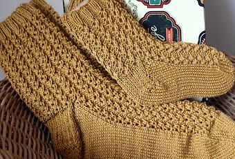 Como ya os avancé en un post anterior, mi patrón escogido fue el Make Mine Lace Socks. Parecía sencillo y me supo mal al principio. Pero después me obligaba a estar tan y tan atenta que tuve un momento de crisis en el que casi volví a cambiar de patrón.Por fin, os descubro el color mostaza de los calcetines de Olalla. Más que mostazas, los definiría como calcetines dorados, de oro viejo, de miel. ¿Qué os parece? ¿Sorprendidas todas aquellas que los creíais azules o lilas?