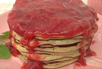 Una vez cocidas todas las tortitas servimos cubriendo con la confitura de fresas.